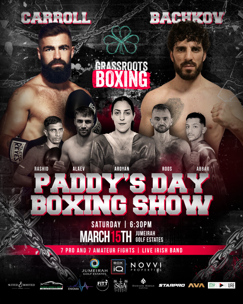 Experience the thrill of Grassroots Boxing this Paddy’s Day Weekend! On Saturday, March 15th, join us at Jumeirah Golf Estates for an unforgettable night of Pro, Amateur, and White Collar Fights. Witness raw talent and relentless action in an electrifying atmosphere!